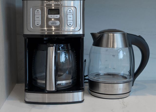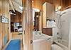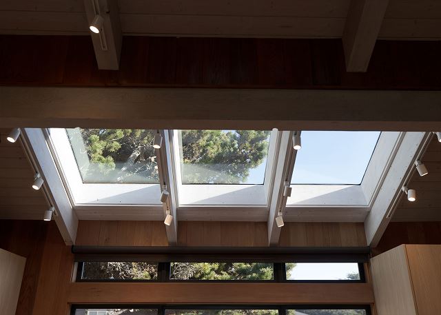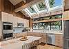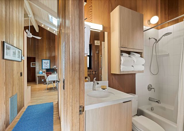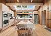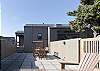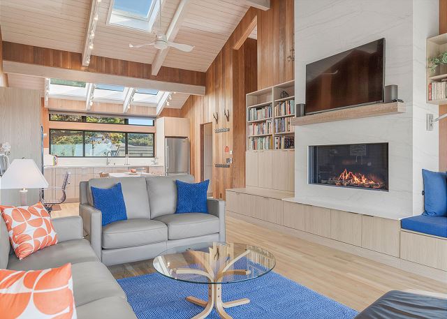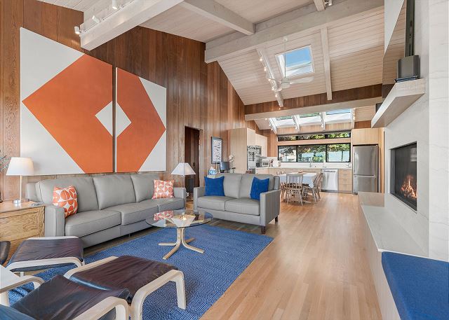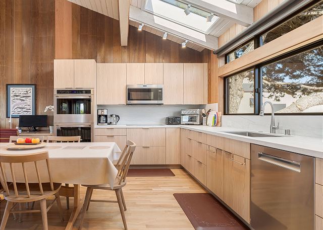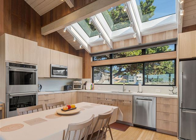 A gas grill is available for use in the enclosed entry courtyard. The light filled kitchen was newly renovated in 2025 and is well equipped for preparing meals in house while staying at Gray Whale and the dining table has seating for six.