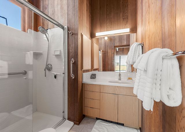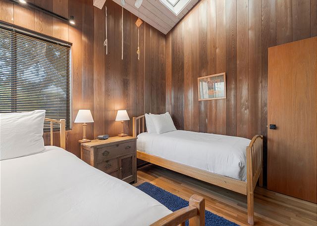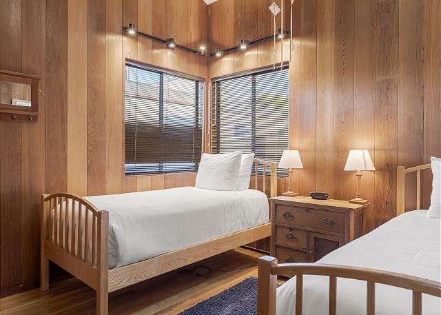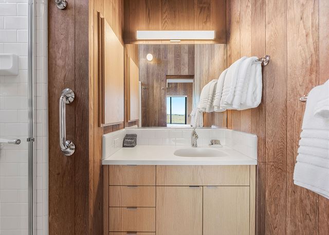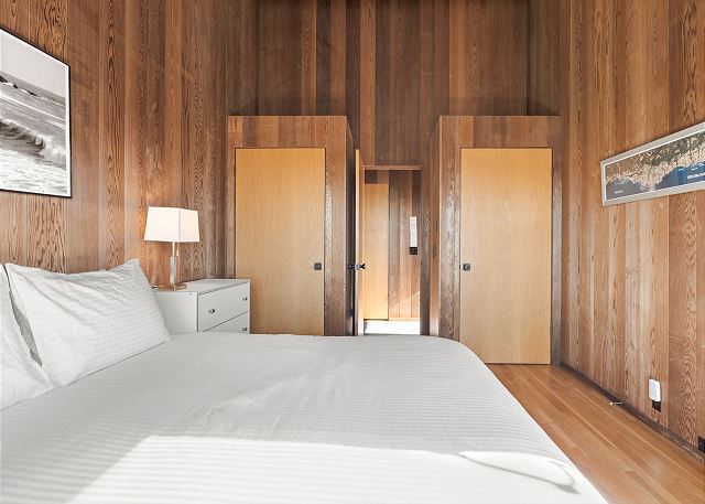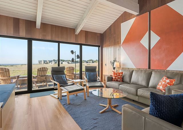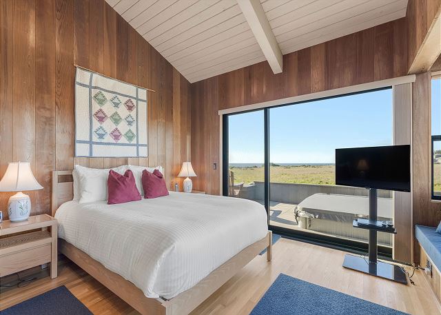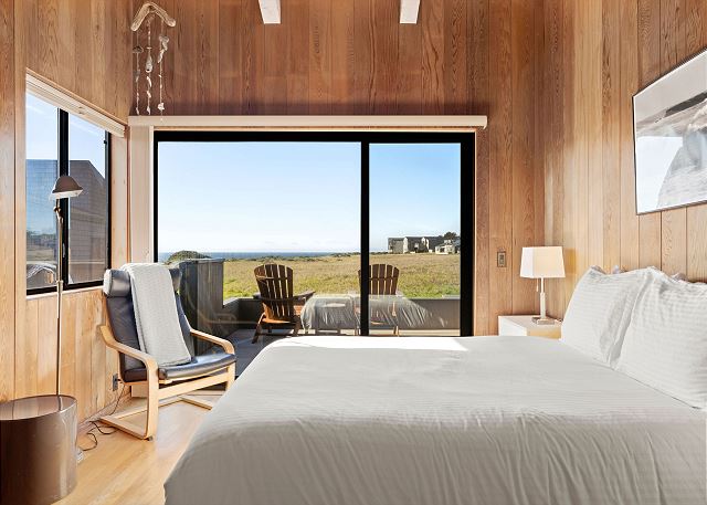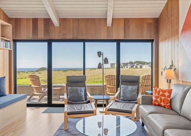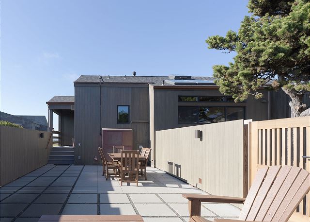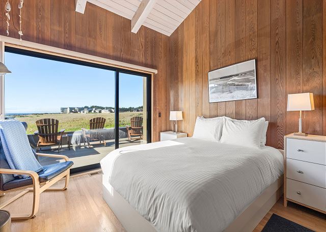 Gray Whale: Unit 35C Lot 44. Lovely single level contemporary home attractively furnished with unobstructed wide blue water views. Gray Whale house will sleep six people comfortably with its three bedrooms and two bathrooms. The master bedroom includes a comfy window seat with meadow views for curling up with a good book and watching the deer, foxes, rabbits, and birds that frequent the meadow just outside. A sliding glass door from the master bedroom leads you to the large deck with hot tub and Adirondack chairs for ocean and wildlife viewing. The first guest bedroom has blue water and meadow views and is conveniently located just steps from the guest bathroom with a tub/shower combo. The second guest bedroom has two twin beds for children or singles with a bathroom containing a walk-in shower nearby which is shared with the master bedroom.